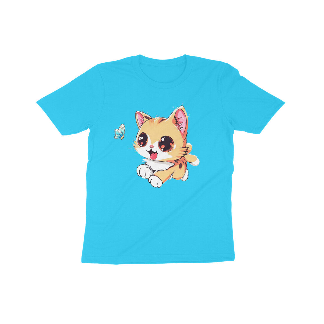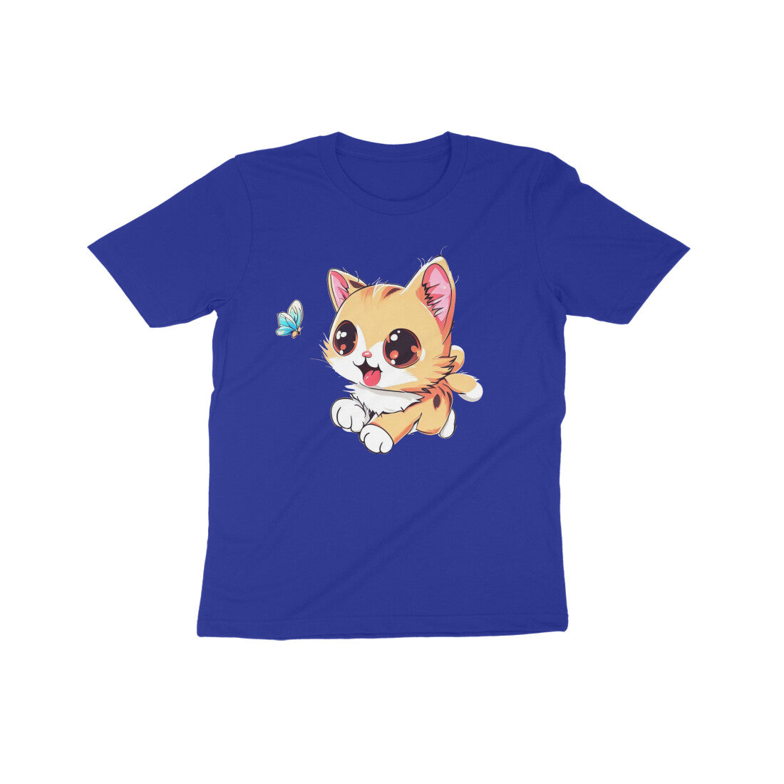 Embrace Playfulness with Our Kid's Round Neck T-Shirt featuring a charming design of a cute cat chasing a butterfly. This delightful and vibrant t-shirt is the perfect addition to your child's wardrobe, capturing the essence of a joyous and carefree spirit.